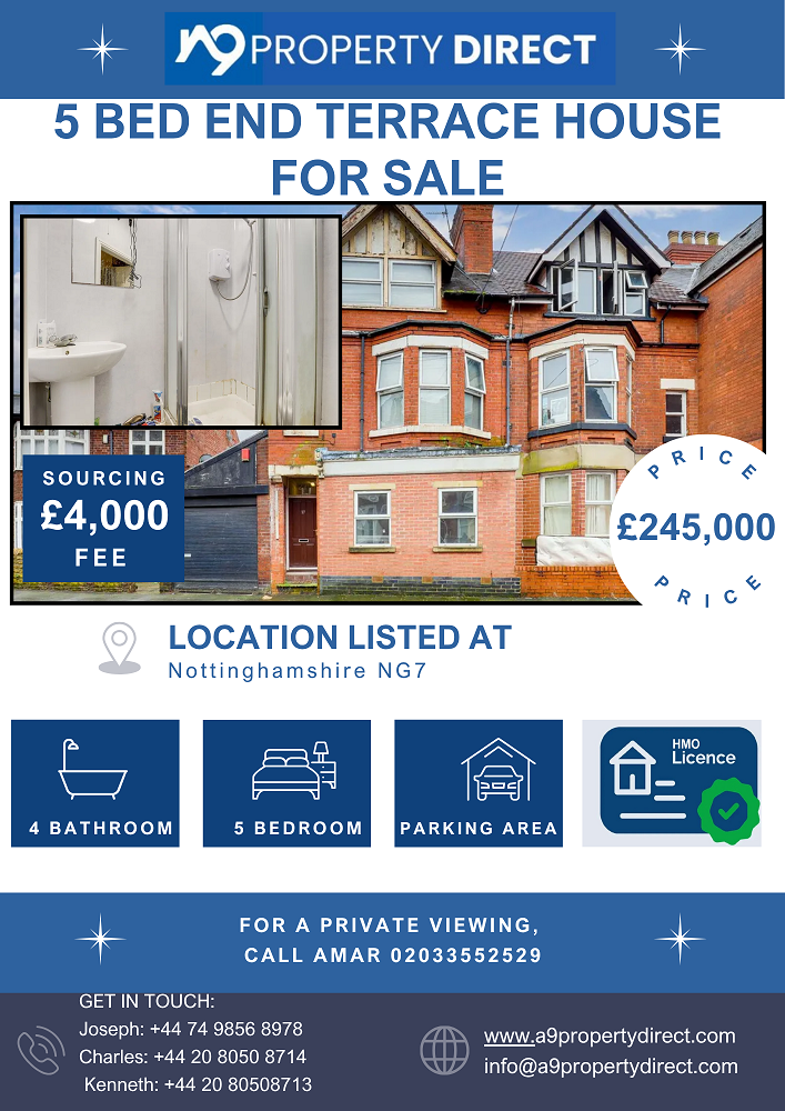 Welcome to this exceptional investment opportunity – a spacious five-bedroom end-terraced HMO property currently for sale with tenants insitu, the property does also have the option to be purchased vacant. The ground floor boasts a welcoming entrance hall leading to a generously-sized living room, a kitchen and a convenient utility room. Additionally, a ground-floor bedroom with its own en-suite offers versatile living options. The first floor comprises two bedrooms, one with an en-suite, a three-piece bathroom suite and a separate W/C for added convenience. Ascend to the second floor to discover two more bedrooms, one of which features its own en-suite. The exterior features A courtyard-style garden which provides an outdoor space. Nestled in a highly convenient location, this property offers easy access to a range of local amenities, excellent transport links, tram stops, commuting options and the vibrant Nottingham City Centre.