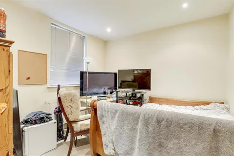 The fifth bedroom has carpeted flooring, a TV point, a radiator, recessed spotlights and a window to the front elevation
